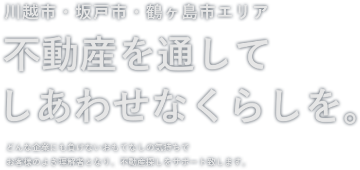坂戸市・川越市・鶴ヶ島市を中心に初めてのご購入から住み替えまで戸建て、マンション、土地と幅広い不動産情報を検索できます。