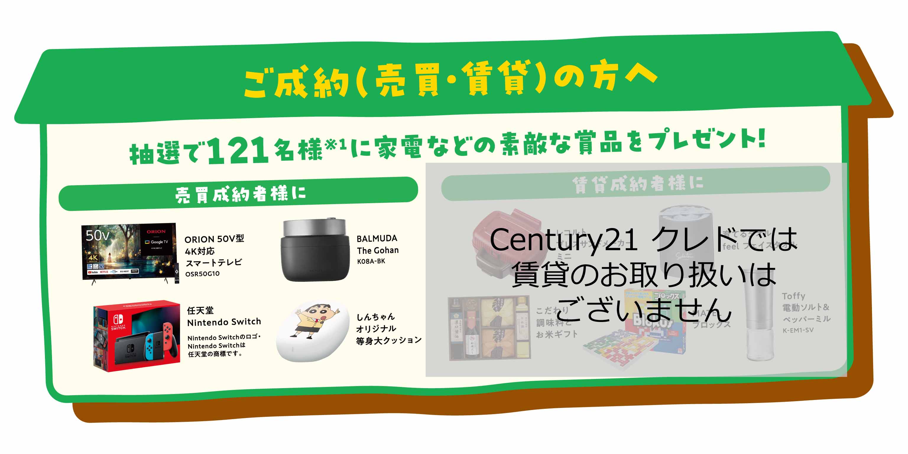 期間中にご成約(売買)の方へ抽選で121名様に家電などの素敵な商品をプレゼント!