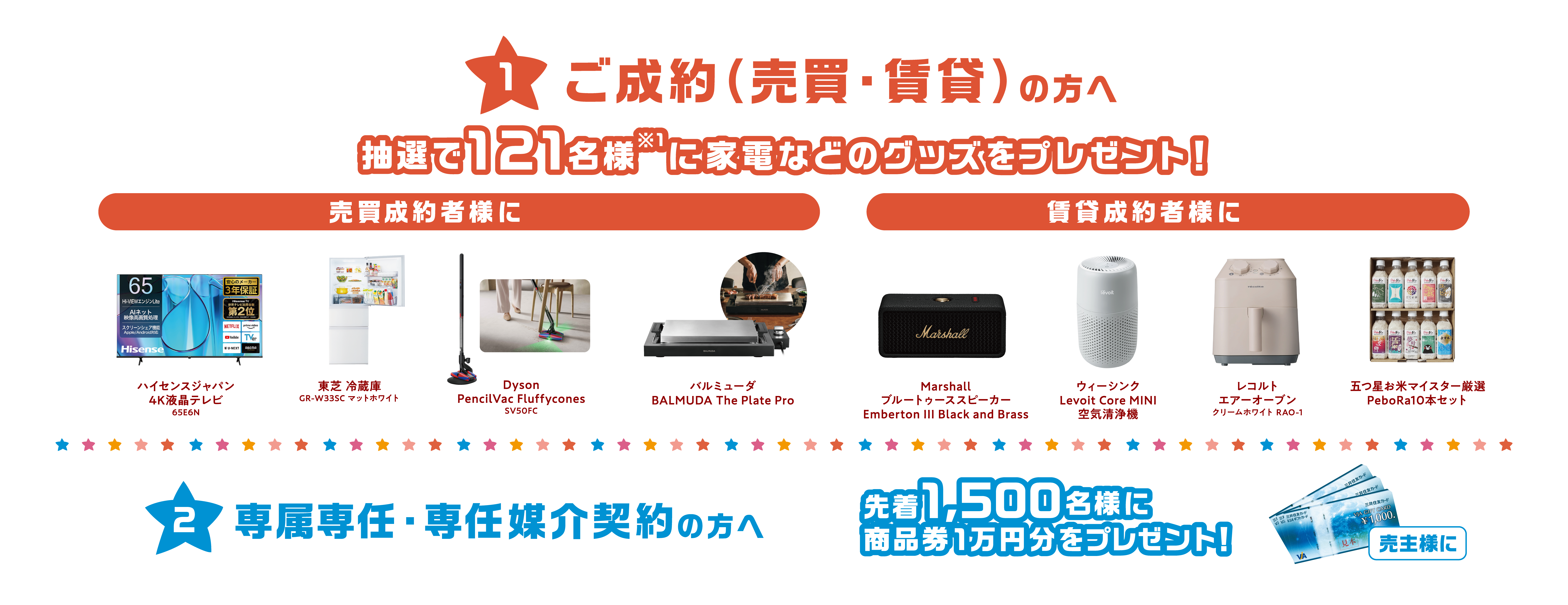 期間中にご成約(売買)の方へ抽選で121名様に家電などの素敵な商品をプレゼント!