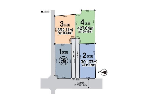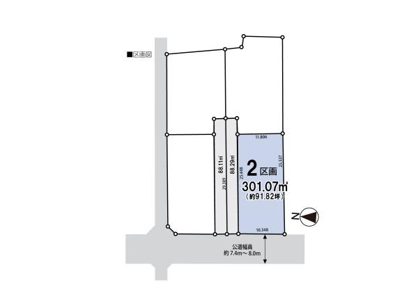 | 現況/引渡し | 更地/相談 | 接道状況 | 接道: 西 公道 道路幅: 7.4m |