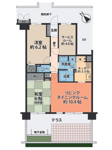 | 間取り | 2SLDK (LD10.4/K3.3/和室6/洋室6.2/S4) | ||||