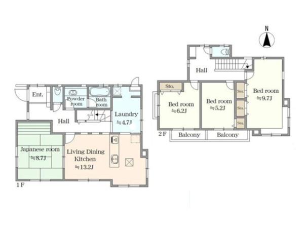 | 築年月 | 1995年2月築 | 間取り | 4LDK (LDK13.2/和室8.7/洋室6.2/洋室5.2/洋室9.7) | ||