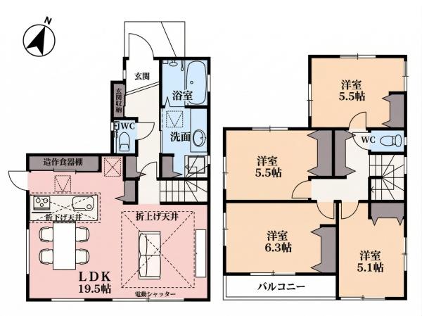 | 築年月 | 2026年7月築 | 間取り | 4LDK (LDK19.5/洋室5.1/洋室5.5/洋室5.5/洋室6.3) | ||